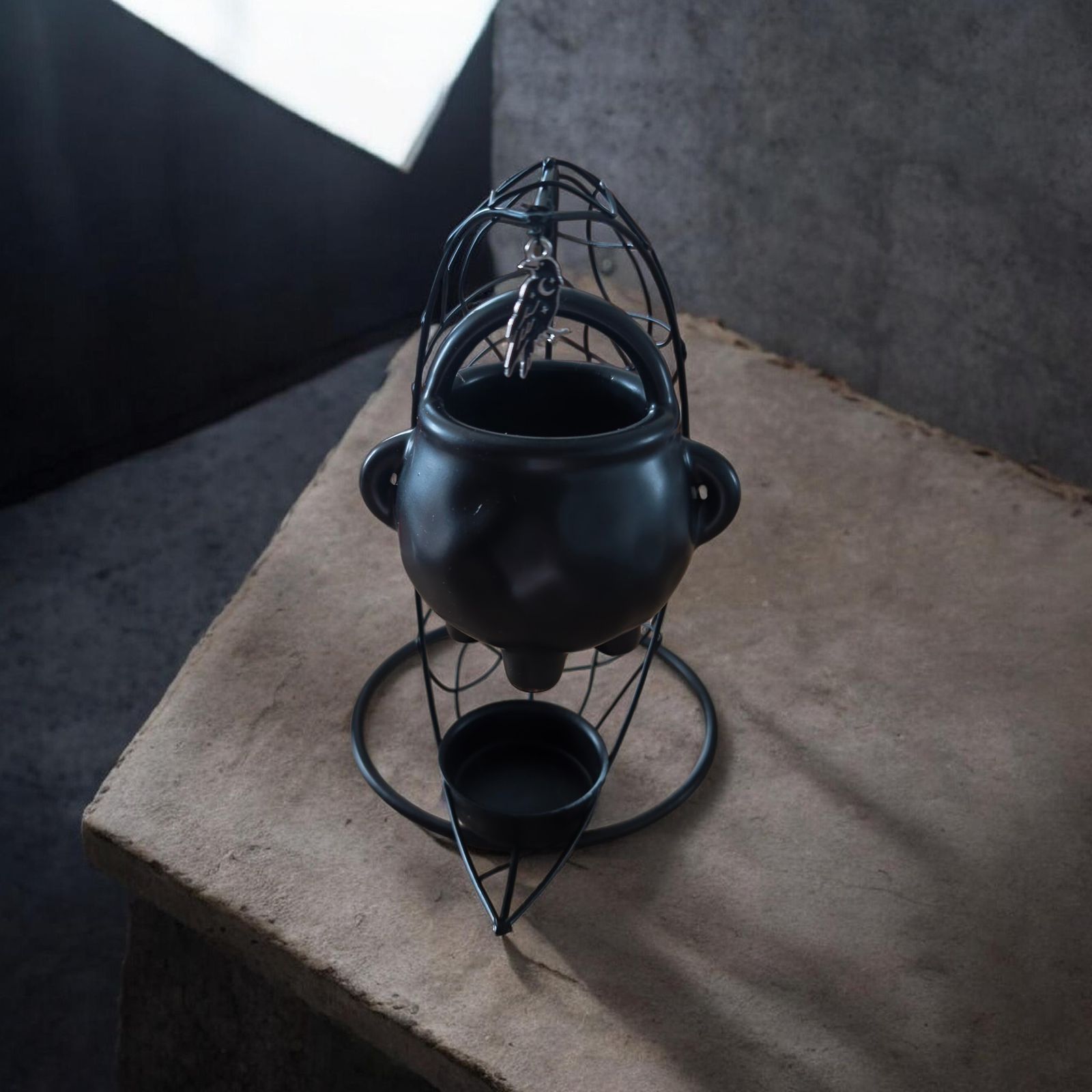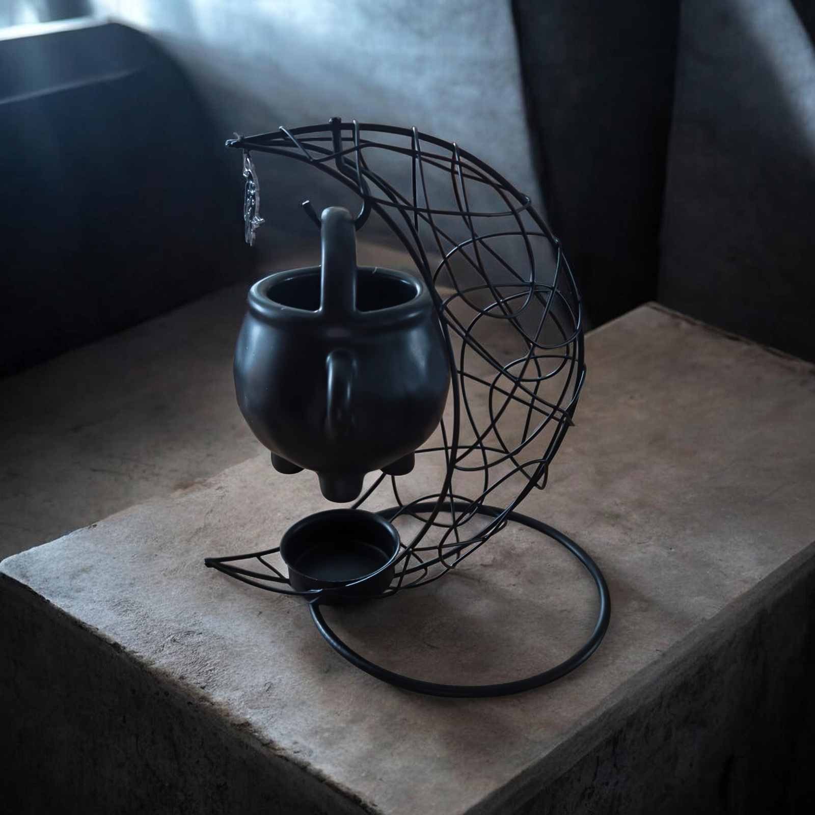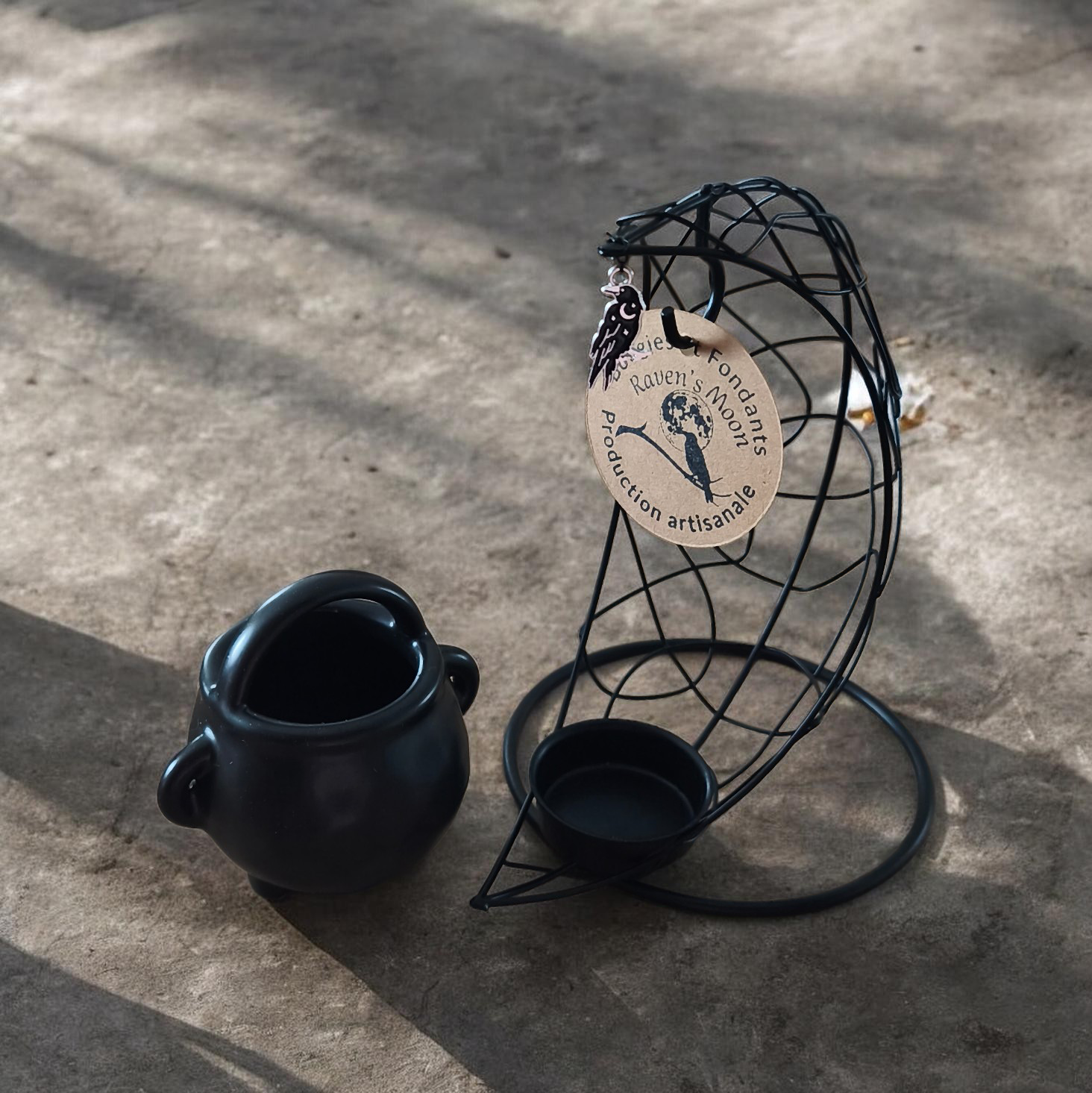 Calysta allie élégance, mystère et ambiance cosy. Ce brûleur suspendu en forme de chaudron, accroché à un croissant de lune en métal ajouré, transforme votre espace en un lieu enchanteur. Parfait pour diffuser vos fondants parfumés, il apporte une atmosphère chaleureuse et apaisante à vos rituels, méditations ou soirées cocooning.