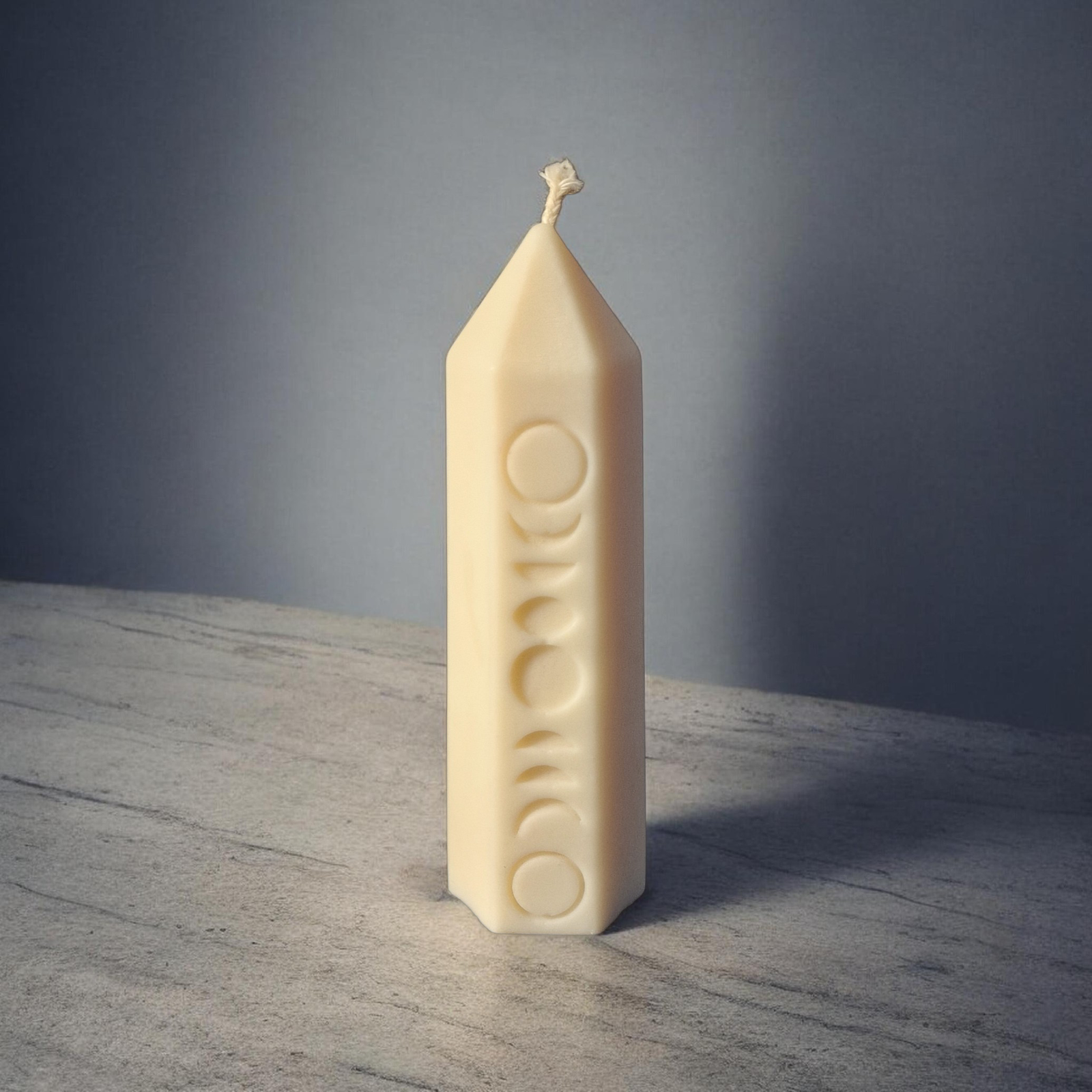 Née de la rencontre entre la lumière et le mystère, la bougie Pilier Rituel se dresse comme un véritable talisman. Sa forme hexagonale, symbole d’harmonie et de protection, est sublimée par les phases de la lune finement sculptées en relief, gardiennes du temps et des énergies invisibles.